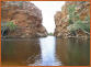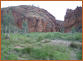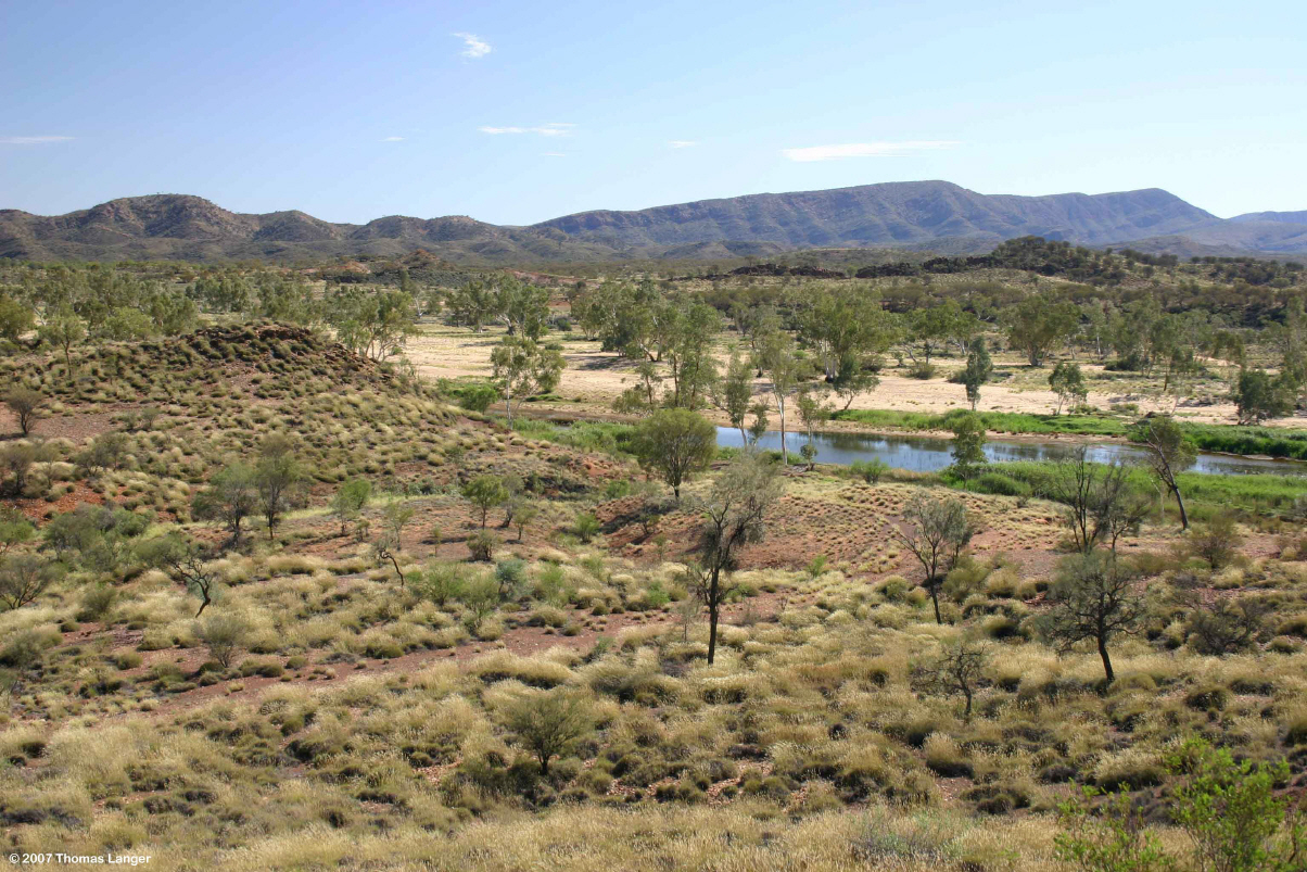 Westlich von Alice Springs reicht der massive Block der West MacDonnell Ranges rund 160 km nach Westen. Der National Park wurde 1992 gegruendet, nachdem die Regierung des Northern Territory 170.000 ha Landanteile von fuenf umliegenden Rinderfarmen gekauft hatte, die einst die Sehenswuerdigkeiten des Parks getrennt hatten. Man findet dort eine Reihe von landschaftlich sehr reizvollen Plaetzen. Wie z.B. die Glen Helen Gorge. Sie besteht im Wesentlichen aus einer eindrucksvollen Schlucht mit einem tiefen Wasserloch, geschaffen vom Durchbruch des geologisch sehr alten Finke River. Für die Arandastaemme ist das tiefe Wasserloch die Heimat der Riesenwasserschlange. Aus der kalten Tiefe dieses Gewaessers sollen die ersten gestaltlosen Wesen der Traumzeit hervorgegangen sein. Auf interessante Felsformationen trifft man im Osten (Window in the Rock) und im Westen (Organ Pipes). Eine Wanderung führt entlang des alten Flussbetts. Glen Helen ist ausserdem ein netter kleiner Campingplatz. Welchen wir fuer unsere erste Nacht im Red Center nutzten. Ach ja, hier kauften wir auch unser Fliegennetz. Dies ist um diese Jahreszeit unersetzlich. Nur mit diesem Netz auf dem Kopf kann man sich draussen in Ruhe bewegen.
